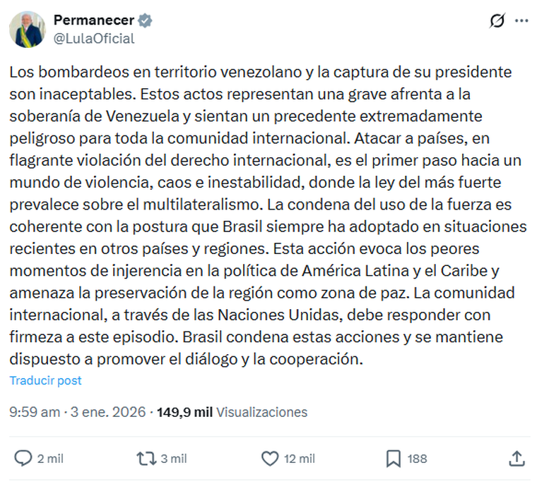 En su mensaje, Lula subraya que las acciones estadounidenses sientan un “precedente extremadamente peligroso” para la comunidad internacional. Asegura que este tipo de intervención puede tener repercusiones alarmantes en otros países y en el equilibrio del sistema internacional en su conjunto.